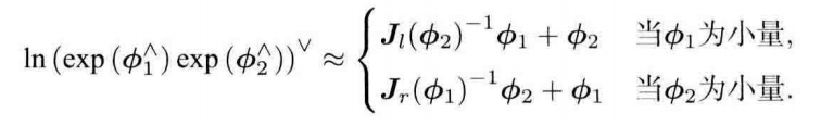 反之,如果在李代数上进行微小的加法,可近似为李群上带左右雅可比的乘法:$$\exp((\phi+ \Delta \phi)^{\wedge})=\exp((\mathbf{J_{l}} \Delta \phi)^{\wedge}) \exp(\phi^{\wedge})=\exp(\phi ^{\wedge})\exp((\mathbf{J_{r}} \Delta \phi)^{\wedge})$$