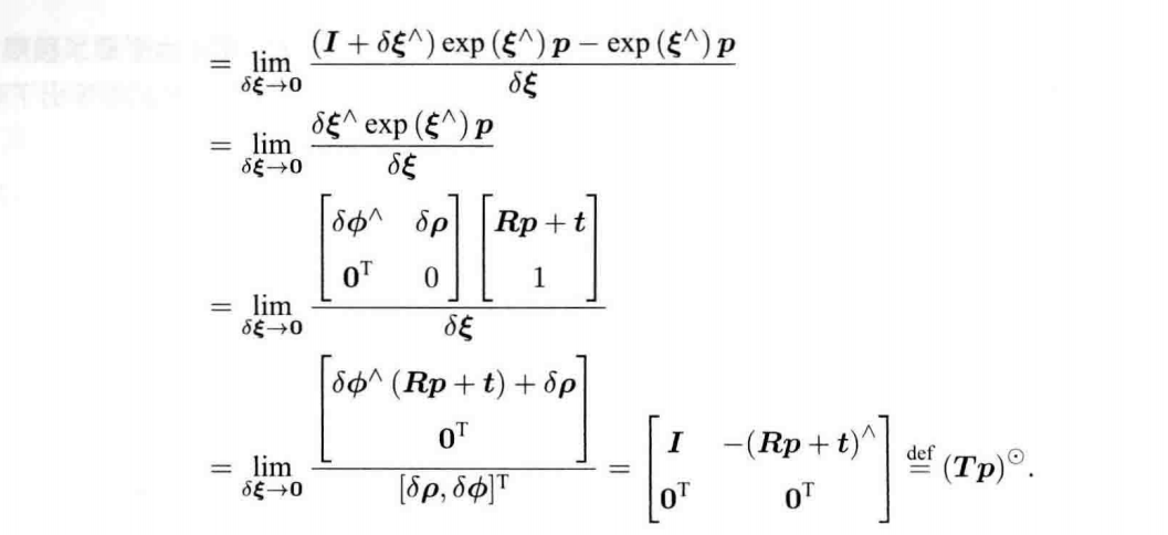 就有:$$\frac{\partial(Tp)}{\partial \delta \xi}=\lim_{ \delta \to 0 } \frac {\exp(\delta \xi ^{\wedge}) \exp(\xi ^{\wedge})p-\exp(\xi ^{\wedge})p}{\delta \xi}$$