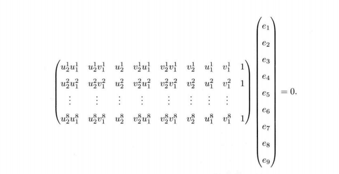 我们希望变为$Ax=0$的形式,那样会好写很多,所以有下面的变换:$$\mathbf{e}=[e_{1},e_{2},e_{3},e_{4},e_{5},e_{6},e_{7},e_{8},e_{9}]^{T}$$