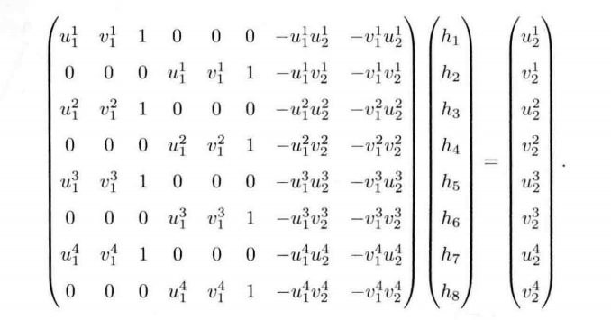 - $v_{2}=\frac{h_{4}u_{1}+h_{5}v_{1}+h_{6}}{h_{7}u_{1}+h_{8}v_{1}+h_{9}}$ 实际中,若$h_{9} \neq 0$,则令$h_{9}=1$,整理得到: