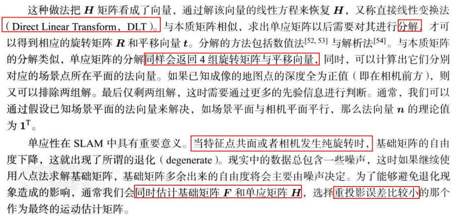 在单目视觉中,对两张图像的$t$的归一化相当于固定了尺度,虽然不知道实际的长度是多少,但我们以这时的$t$为单位1,计算相机运动和特征点的3D位置,这被称为单目SLAM的初始化。