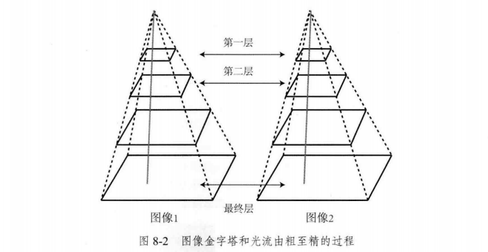刚才提到,光流需要相机的运动比较小,两张图像的差异不能太大,但是如果就是很大,单层图像光流容易达到一个局部极小值,但是还有补救的措施,就是构建图像金字塔,之前已经提过,就是对图像进行缩放,原始图像作为底层,每往上一层,就对下层图像进行一定倍率的缩放。
