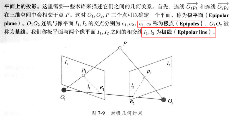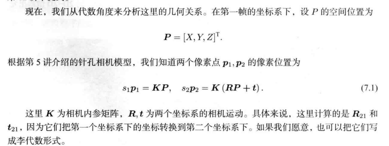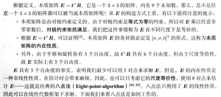 “对极约束简洁地给出了两个匹配点的空间位置关系。于是,相机位姿估计问题变为以下两步”: