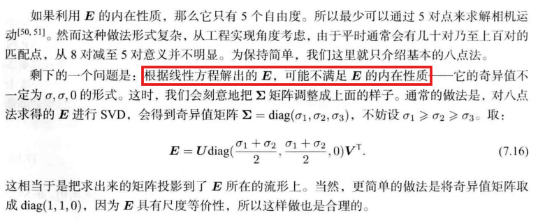 这样就把本质矩阵$E$求出来了,现在要恢复出相机的运动$R,t$,使用奇异值分解(SVD)得到,设$E$的$S V D$为:$$E=U \Sigma V^{T}$$
