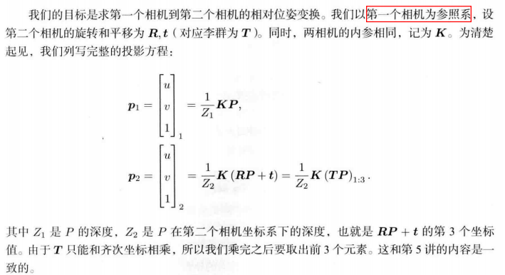 还有就是第一个式子不带变换矩阵应该也是为了简洁,因为只有两张图像,所以干脆P的坐标就是在相机1下的空间坐标