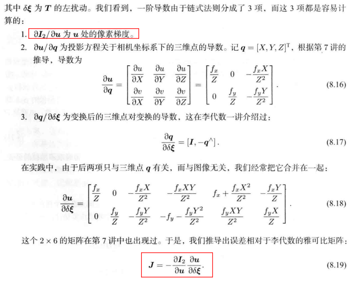 这同样可以通过解一个优化问题完成,但是此时优化的不是重投影误差,而是光度误差,也就是$P$的两个像素的亮度误差:$$e=I_{1}(p_{1})-I_{2}(p_{2})$$