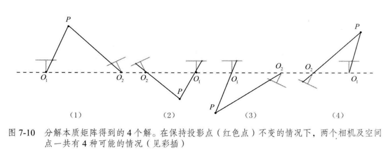 在$SVD$分解中,对于任意一个$E$,存在两个可能的$t,R$与它对应:$$t_{1}^{\wedge}=U R_{Z} \left( \frac{\pi}{2} \right) \Sigma U^{T},\;\;\;\;\;R_{1}=UR_{Z}^{T} \left( \frac{\pi}{2} \right) V^{T}$$