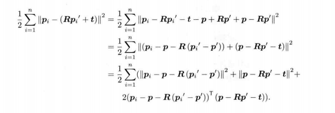 其中$p_{i}-p$和$p_{i}'-p'$在求和后就是0,所以最后一项直接消失,目标函数可以简化为:$$\underset{R,t}{min} \, J= \frac{1}{2} \sum^{n}_{i=1} \| p_{i}-p-R(p_{i}' -p') \|^{2} + \| p-Rp'-t \|^{2}$$